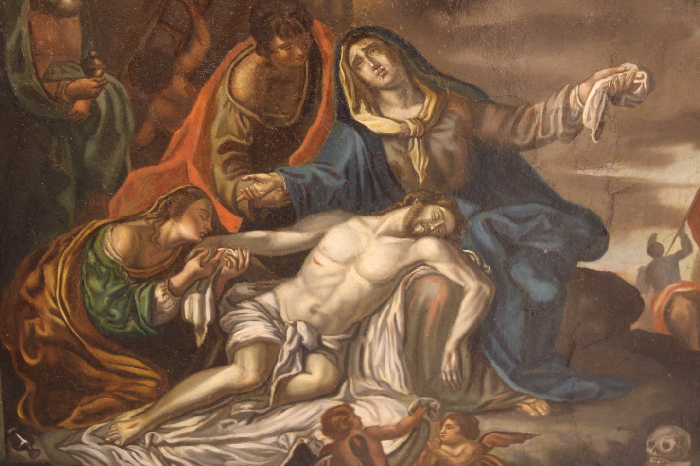 Descrizione: Dipinto a olio su carta e poi su tela raffigurante la deposizione del Cristo morto. Misura: h 50x40 cm. Epoca: prima metà del 700.